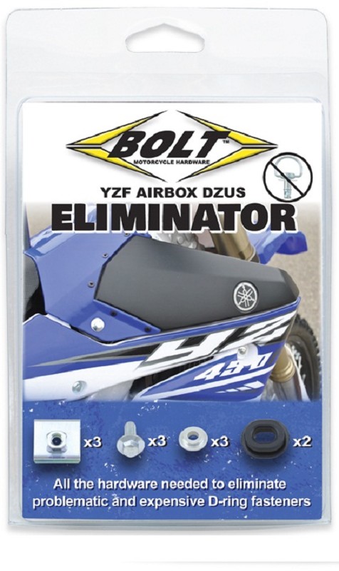 BOLT Airbox Dzus Eliminator Kit YAMAHAYZF250 14-22YZF450 14-22WRF250 16-22WRF450 16-22Contains:3x Flangehead Bolts3x Aluminium Bushung2x Rubber Rings3x Clip Nuts.Dzus Eliminator kit provides you with all the hardware necessary to eliminate the stock D-ring airbox fasteners that are prone to falling out on the newer Yamaha YZ & WR models. Replace those quarter turn pins with more reliable hex flange bolts using our affordable kit and get rid of your Dzus induced headaches!Video Link - www.youtube.com/watch?v=163iZ5uVyq0 SKU: BMH-YZ.DE, BMH-YZDE