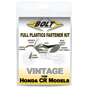 Bolt has done the research for you and put together a fastener kit with all the factory style hardware you need to fasten your front fender, number plate, fork guards, radiator shrouds, seat, rear fender and side panels. Satisfaction guaranteed.