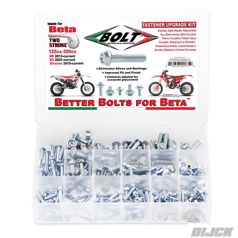 BOLT Pro-Pack BETAALL 2-STROKE RR/XTR/RX 13-23Reserve set met verschillende bouten, moeren, schroeven en revetten. Gemaakt om op alle Europese cross en enduro motoren te passen. Meer dan 180 hardware stukken van KTM in de juiste grootte en afwerking. Nieuwe versie beschikt over torx schroeven, voor en achter remschijf bouten, billet aluminium bussen, compressie ringen en aluminium Rim-Lock revetten, en een volledige set van zwarte tandwiel bouten en moeren. Ontworpen voor KTM, Husqvarna en Husaberg full size modellen.De hardware voldoet aan of overtreft OEM specificaties. BETA Style Pro-Pack Inhoud:BETA Factory Style Flensbouten (8) M5 Euro Style kuiltjes 8mm Hex Flange Bolt (6) M5x16mm Torx flensbouten (2) M5x20mm Torx flensbouten (6) M6x12mm Torx flensbouten (4) M6x16mm Torx flensbouten (8) M6x20mm Torx flensbouten (8) M6x25mm Torx flensbouten (6) M6x30mm Torx flensbouten (4) M6x40mm Torx flensbouten (2) M6x45mm Torx flensbouten (2) M6x50mm Torx flensbouten (4) M6x55mm Torx flensbouten (6) M8x25mm Torx flensbouten (6) M8x30mm Torx flensboutenBETA Factory Style Grote Flensbouten (6) M6x12 Torx Grote Flens Bout (6) M6x12 Plastic Bout (6) M6x20 Torx Grote Flens BoutBETA Factory Plastic Schroeven (8) M6x20mm Plastic Schroef (Ejot)BETA Factory Style Remschijf Bouten (12) M6 Remschijf Bouten met DraadlockBETA Factory Style Sub-Frame Bouten (4) M8 Sub-frame BoutBouten van het tandwiel (6) M8 Zwarte tandwiel Bout (6) M8 Zwarte locking tandwiel BoutSluitringen (4) M6 Convex Tussenring met flens (4) M6 Spadbord RevetMoeren (3) M8 Fuji Moer (2) M6 Flensmoer (2) M6 Fuji MoerSchroeven (4) M5x10 Pan Head SchroevfCompressie Sluitringen (3) M6x11mm Koper Crush Revet (4) M10 "Banjo Bout" Aluminium Crush Revet (4) M12x20mm Aluminium Crush RevetAluminium bussen en Kraag (2) M8 Aluminium Rim-Lock Spacer (2) M8 Aluminium Euro Style Pipe Mount Bus (2) M6 Aluminium Euro Style Pipe Mount Bus (4) M6 Aluminium Afgesneden Collar Revet (1) M6 Aluminium verzonken kraag Revet (2) M6 Aluminium Bus voor SX & XC achterspatbordenValve Stem Onderdelen (2) Valve Cap Zwart (1) Metalen schroevendraaier ventiel Cap (2) ventiel dopjesSplitpennen (2) 2.5mmx25mm Splitpen (6) Brembo Style Remklauw Pen Clip