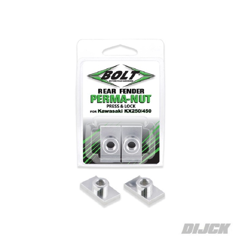 BOLT Rear Fender "PERMA-NUTS" KAWASAKIKX250 21-26KX450 19-26"PERMA-NUTS"Word je ook zo moe van de T-moeren die telkens uit het achterspatbord vallen tijdens het wisslen van de luchtfilter?Dan zijn deze "PERMA-NUTS" de oplossing !!- Achterspatbord "Perma-nuts" vervangen de originele T-moeren van het achterspatbord op Kawasaki-modellen KXF250 21-23 / KXF450 19-23. - "Perma-nuts" zijn gemaakt van 6061 aluminium, klikken vast op het achterspatbord en vallen er niet uit tijdens filterwissels.- Vervanging van het Kawasaki onderdeel nummer 92210-1635, 922101635SKU: BMHKNUT, BMH-KNUT