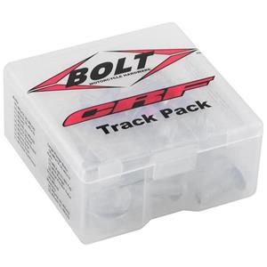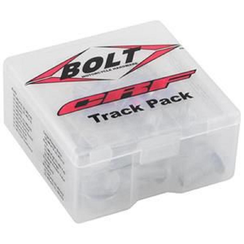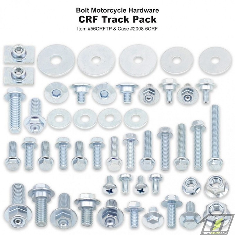 BOLT Track Pack II CRF (56 pcs)Designed for full size CR and CRF models. M6 and M8 flange boltsRadiator shroud boltsFork guard boltsSub-frame boltsBrake master cylinder boltsChain slider hardwareT-nutsFlange nuts and more! - CRF250 04-26- CRF450 02-26 Omschrijving:De nummer één aftermarket bevestigingsset! Het CRF trainingspakket bevat 48 stuks hardware in de fabrieksstijl, waaronder: M5, M6 en M8 zeskantflensbouten, borg- en niet-blokkerende flensmoeren, ringen, schroeven en een t-moer van het achterspatbord.Ontworpen voor motorcross en off-road Japanse motorfietsen van de CRF modellenOnze hardware voldoet aan of overtreft OEM-specificaties. Met trots ontworpen en geassembleerd in de VS met componenten uit de VS en Taiwan.DescriptionThe number one aftermarket fastener kit! The CRF Track Pack has 48 pieces of factory style hardware including: M5, M6 & M8 hex flange bolts, locking and non-locking flange nuts, washers, screws and a rear fender t-nut. Designed for late model motocross and off-road Kawasaki CRF motorcycles.Our hardware meets or exceeds OEM specs. Proudly designed and assembled in the USA with components from the USA & Taiwan.BOLT Partnumber: 56CRFTP