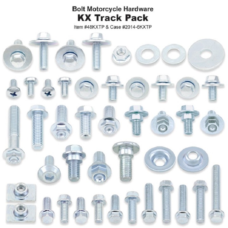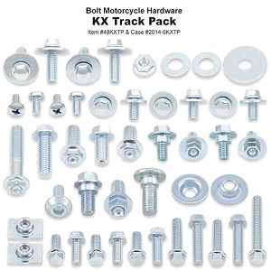 The number one aftermarket fastener kit! The KXF Track Pack has 48 pieces of factory style hardware including: M5, M6 & M8 hex flange bolts, locking and non-locking flange nuts, washers, screws and a rear fender t-nut.