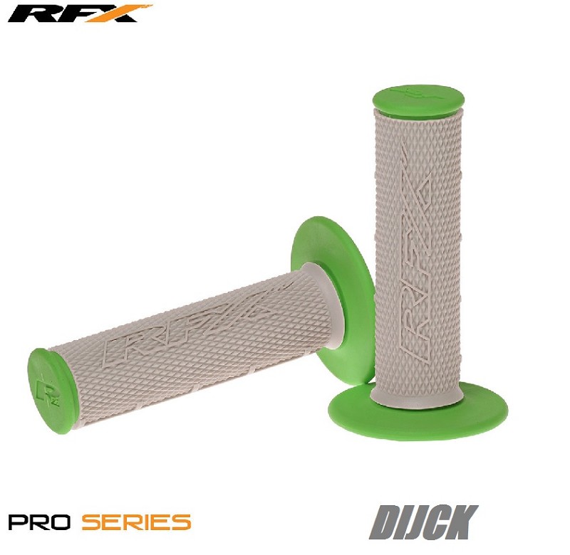 RFX Pro Series Dual Compound Grips Green Ends (Green/Grey)Product DescriptionRFX Grips are manufactured from high spec synthetic Kraton Polymer and feature the vibration reduction benefits and stickiness of natural rubber but resist damage caused by sunlight and chemicals that occur with natural rubber.RFX Grips feature a dual density design which allows for an external 60 SA compound that is more durable and resists crash damage. Yet has a soft centre 25 SA compound grip area for the best vibration resistance and comfort available.RFX Grips use the industry standard half waffle design with a level RFX Logo on the palm, this upper diamond and lower waffle design gives the best combination of palm area comfort and lower grip for muddy conditions. Dual Density Grip Features- Made using high spec synthetic Kraton Polymer for the ultimate sticky grip.- Dual Compound tool design allows for the best combination of compounds.- 25 SA centre compound improves comfort and reduces vibration.- 60 SA end compound improves crash damage resistance.- Half Waffle design gives the best combination of grip and comfort.- Smooth diamond pattern and level RFX logo on the palm area offer excellent grip without sacrificing comfort and causing blisters.- Waffle design on the finger area gives the best grip available for muddy conditions- Available in 26 colour combinations.- Packaged in pairs for use with right hand twist throttle machines.Handvaten Handvatten Grips