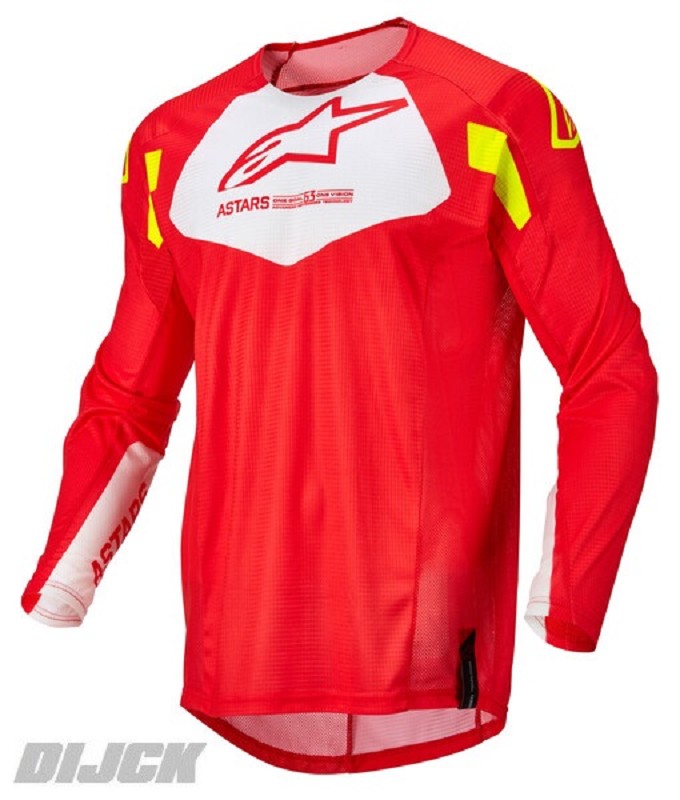 ALPINESTARS Youth Jersey Racer Factory Red Fluo / White / Yellow Fluo Size XL- Advanced poly-fabric construction is lightweight, moisture-wicking and durable, with mechanical stretch for enhanced rider comfort.- Cut longer in the rear for greater coverage when riding.- Sport collar neck construction for superior rider comfort.- Fade resistant sublimated graphics.- Fitted Wrist cuffs for an optimized fit.ALPINESTARS Partnumber: 37710223025