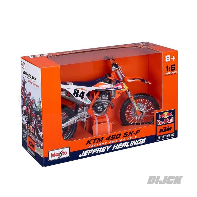 Maisto KTM Mini Motor KTM Red Bull Jeffrey HerlingsReplica Schaal 1:6 GROOTProductbeschrijvingGedetailleerd schaalmodel van Maisto van de Ktm 450 SX-F #84 JEFFREY HERLINGS (DUTCH RIDER) RED BULL KTM SUPERCROSS in de schaal 1:6 en kleur oranje/blauw/wit. Voorzien van officiële licentie van Ktm.Partnumber, SKU: M32228Speelgoed, Crossmotortje