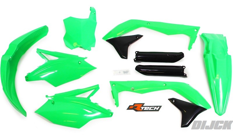 RACETECH Plastic Kit KX450F 16-18 FLUOR GREEN Front Fender Fluor Green Rear Fender Fluor Green Radiator Scoops Fluor Green/Black Side Panels Fluor Green Number Plate Fluor Green Fork Guards Black