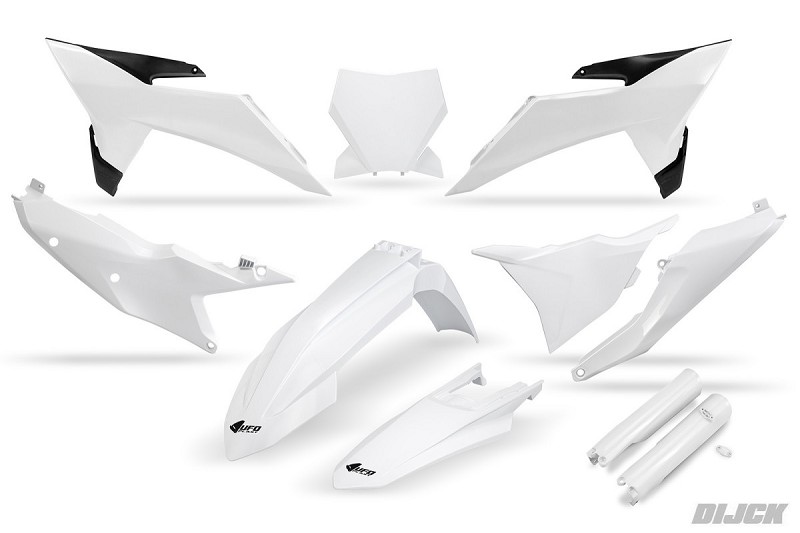 UFO FULL Plastic Kit WHITEInclusief VoorvorkbeschermersKTMSX125 25-26 SX250 25-26 SX300 25-26 SXF250 25-26 SXF350 25-26 SXF450 25-26 Kit bevat de volgende delen:- Airbox Covers / Nummerborden- Radiateurkappen- Voornummerbord- Voorspatbord- Achterspatbord- VoorvorkbeschermersPlastic kit, PlastickitPartnumber: KTKIT532F-042, UKTKIT532WH, KTKIT532F042, KTKIT532F
