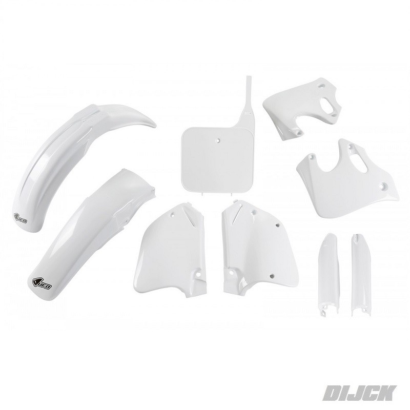 UFO Plastic Kit WHITE ColourIncluding Fork GuardsHONDACR125 93-94CR250 92-94Kit includes:- Front Fender White- Rear Fender White- Side Panels White- Radiator Scoops White- Front number Plate White- Fork GuardsSKU: HOKIT096#041, HOKIT096041, HOKIT096