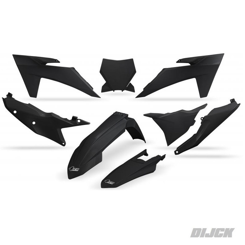 UFO Plastic Kit BLACKKTMSX125 23-24SX250 23-24SX300 23-24SXF250 23-24SXF350 23-24SXF450 23-24Kit bevat de volgende delen:- Airbox Covers / Nummerborden- Radiateurkappen- Voornummerbord- Voorspatbord- AchterspatbordPlastic kit, PlastickitPartnumber: KTKIT529-001, UKTKIT529BK, UKTKIT529