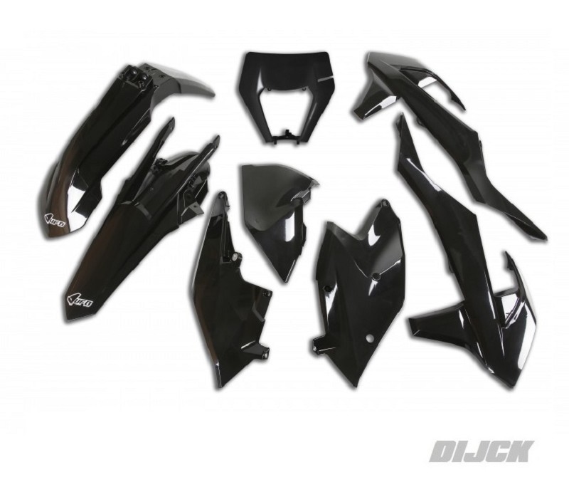 UFO Plastic Kit BLACKKTMEXC125 17-19EXC250 17-18EXC250 TPi 18EXC300 17-19EXC300 TPi 19EXC-F250 17-19EXC-F350 17-19EXC-F500 17-19Kit bevat de volgende delen:- Airbox Covers / Nummerborden- Radiateur Platen- Koplampkap- Voorspatbord- AchterspatbordPlastic kit, PlastickitPartnumber: KTKIT527-001, UKTKIT527BK, UKTKIT527