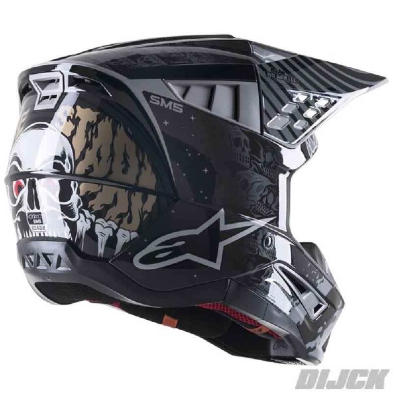 ALPINESTARS S-M5 Solar Flare HelmetBlack / Gray / Gold / GlossySize MDescription:The all-new SM5 helmet is the result of more than five years of intensive study, development and testing. We scrutinized every possible aspect toengineer a helmet that is safe and thoughtfully designed to deliver optimal protection and comfort. This lightweight helmet features a thermo-injectedshell incorporating a special polymer blend enhanced by varying degrees of thickness that is engineered to deliver the optimal combination of impactprotection and light weight, while the five density EPS liner ensures the correct density in the correct area for enhanced impact absorption.1. An engineered raised area with padding effectively reduces the forces transmitted to the collarbone and a patented visorrelease system that ensures the visor is released with the correct pre-determined amount of force, irrespective of theangle of impact.2. Lightweight outer shell is constructed from a technologically advanced impact resistant thermoplastic in two sizes.3. The inner and outer surfaces are engineered to minimize the effects of oblique impacts.4. Multiple density inner liner to ensure the correct density in the correct area for enhanced impact absorption5. Patented visor release system ensures the visor is released with the correct pre-determined amount of force, irrespectiveof the angle of impact.6. Maximized ventilation and high levels of heat transfer exchange thanks to multi-air inlets and exhaust ports.7. The visor has been designed to direct air into the ports for enhanced airflow.ALPINESTARS Partnumber: 83057221959MSKU: 83057221959M
