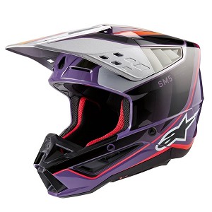 ALPINESTARS S-M5 Sail helmet VIOLET / BLACK / SILVER GLOSSYDe SM5 helm is ontworpen om MX-rijders te voorzien van een helm die veilig is en specifiek ontworpen om optimale bescherming en comfort te bieden. De lichtgewicht SM5 helm heeft een thermo-geïnjecteerde schaal die een speciale polymeermix bevat die wordt versterkt door verschillende diktes, die is ontworpen om de optimale combinatie van impactbescherming en licht gewicht te bieden, terwijl de vijfdichtheid EPS-voering zorgt voor de juiste dichtheid op de juiste plaats voor verbeterde impactabsorptie.Partnumber: 83067233919