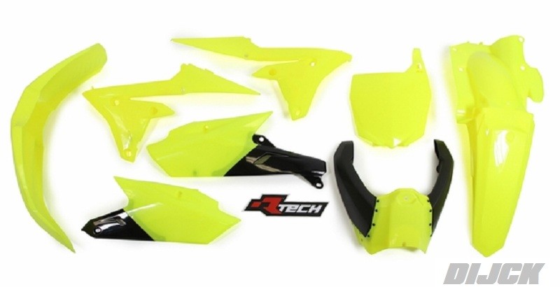 RACETECH Plastic Kit YZF250 14-18 / YZF450 14-17 FLUOR YELLOW - Front Fender Fluor Yellow - Rear Fender Fluor Yellow - Side Panels Fluor Yellow/Black - Lower Radiator Scoops Fluor Yellow - Upper Radiator Scoops Fluor Yellow/Black - Front Number Plate Fluor Yellow