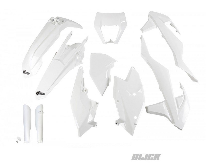 UFO Full Plastic Kit WHITEInclusief VoorvorkkappenKTMEXC125 17-19EXC250 17-18EXC250 TPi 18EXC300 17-19EXC300 TPi 19EXC-F250 17-19EXC-F350 17-19EXC-F500 17-19Kit bevat de volgende delen:- Airbox Covers / Nummerborden- Radiateur Platen- Koplampkap- Voorspatbord- Achterspatbord- VoorvorkkappenPlastic kit, PlastickitPartnumber: KTKIT527F-047, UKTKIT527FWH, UKTKIT527
