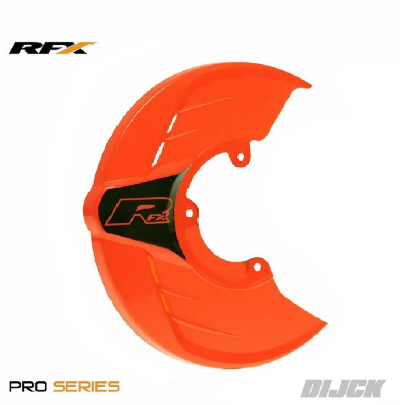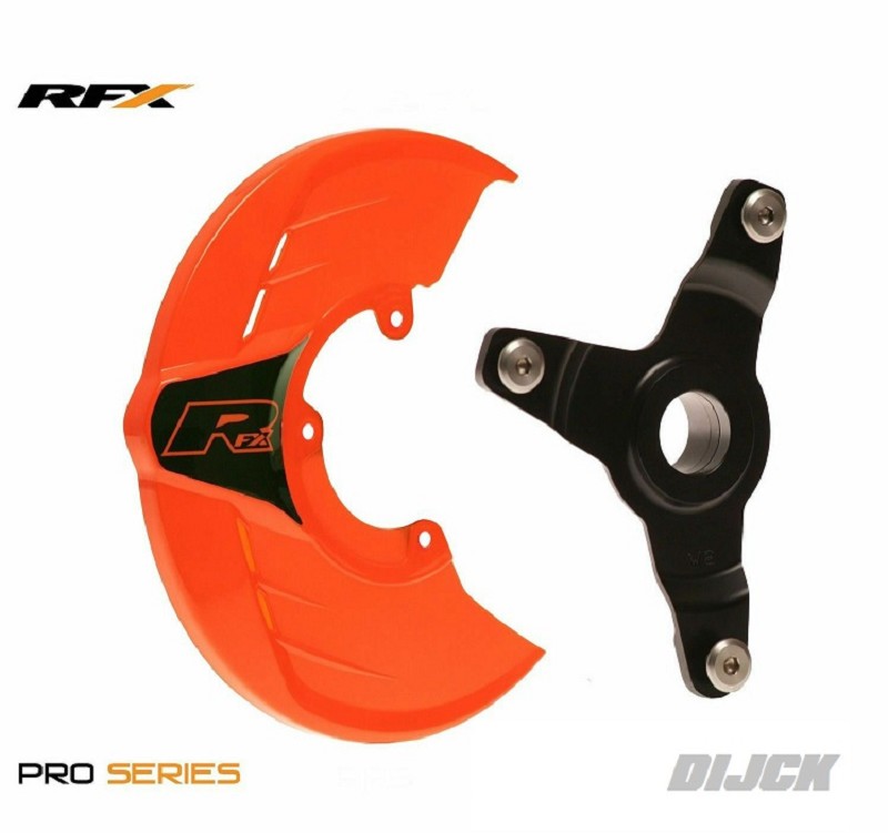 RFX Pro Disc Guard ORANGE (to fit RFX disc mounts)RFX Voorremschijfbeschermer OranjeOmschrijving:De schijfbeschermingen van de RFX Pro-serie helpen de schade aan de remschijf te verminderen door te voorkomen dat stenen en roostes de schijf raken en beschadigen. RFX schijfbeschermingen hebben ook een wielafstandsring om de wielwissels te versnellen, terwijl het ontwerp het nog steeds mogelijk maakt de remklauw door de lucht te laten afkoelen voor een betere remming. Geschikt voor gebruik met extra grote schijven.Kenmerken- Zeer sterke kunststof bescherming.- Beschermt de remschijf tegen stenen en kluiten.- Geschikt voor grote remschijven van 270 mm.- Laat lucht in plaats van de meeste OEM-afschermingen de remklauw afkoelen.- Montagebeugel vervangt wielafstandsstuk voor snellere en gemakkelijkere wielwisselingen.- Billet aluminium beugelconstructie.- 3M kleuren gecodeerd RFX-embleem.- Meerdere kleurencombinaties beschikbaar.- Model specifieke beugel is vereist. Montage-instructies- Verwijder de OEM-schijfbeschermer, de asmoer en draai de spanschroeven los.- Verwijder as en voorwiel.- Verwijder het de afstandsbus van de schijf en vervang deze door de montagebeugel en monteerdeze.- Plaats het wiel opnieuw en zorg ervoor dat de schijf in de remklauw wordt uitgelijnd.- Breng de as in en draai de asmoer vast.- Met de motor op de vloer en met de voorrem erop, comprimeer de voorvork om het voorwiel uit te lijnen.- Draai de klembouten en de asmoer aan.RFX Partnumber: FXDG_90000_99OR, FXDG9000099OR