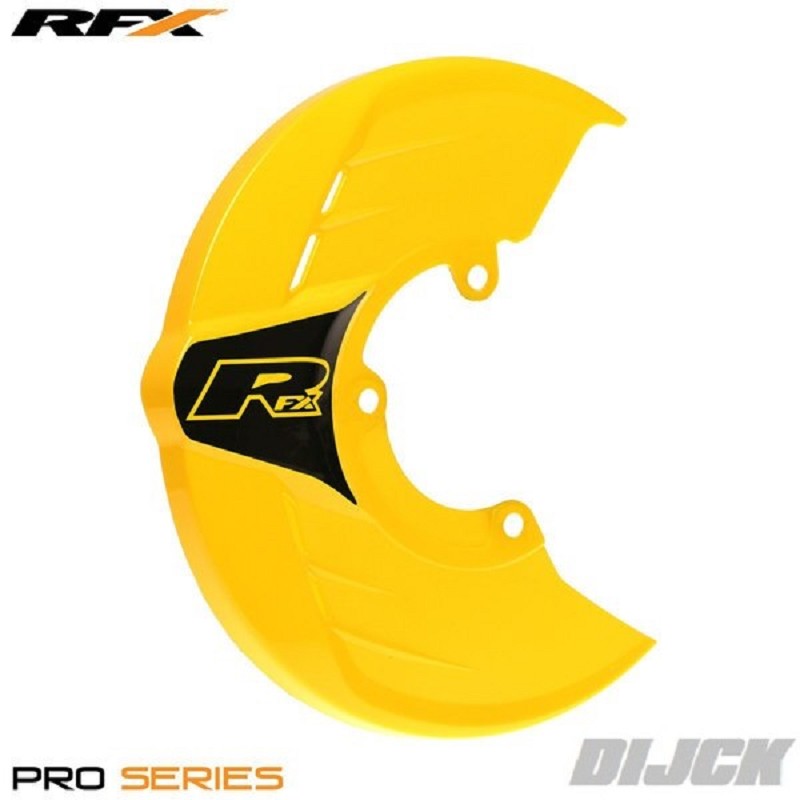 RFX Pro Disc Guard YELLOW (to fit RFX disc mounts)RFX Voorremschijfbeschermer GeelOmschrijving:De schijfbeschermingen van de RFX Pro-serie helpen de schade aan de remschijf te verminderen door te voorkomen dat stenen en roostes de schijf raken en beschadigen. RFX schijfbeschermingen hebben ook een wielafstandsring om de wielwissels te versnellen, terwijl het ontwerp het nog steeds mogelijk maakt de remklauw door de lucht te laten afkoelen voor een betere remming. Geschikt voor gebruik met extra grote schijven.Kenmerken- Zeer sterke kunststof bescherming.- Beschermt de remschijf tegen stenen en kluiten.- Geschikt voor grote remschijven van 270 mm.- Laat lucht in plaats van de meeste OEM-afschermingen de remklauw afkoelen.- Montagebeugel vervangt wielafstandsstuk voor snellere en gemakkelijkere wielwisselingen.- Billet aluminium beugelconstructie.- 3M kleuren gecodeerd RFX-embleem.- Meerdere kleurencombinaties beschikbaar.- Model specifieke beugel is vereist. Montage-instructies- Verwijder de OEM-schijfbeschermer, de asmoer en draai de spanschroeven los.- Verwijder as en voorwiel.- Verwijder het de afstandsbus van de schijf en vervang deze door de montagebeugel en monteerdeze.- Plaats het wiel opnieuw en zorg ervoor dat de schijf in de remklauw wordt uitgelijnd.- Breng de as in en draai de asmoer vast.- Met de motor op de vloer en met de voorrem erop, comprimeer de voorvork om het voorwiel uit te lijnen.- Draai de klembouten en de asmoer aan.RFX Partnumber: FXDG_90000_99YL, FXDG9000099YL
