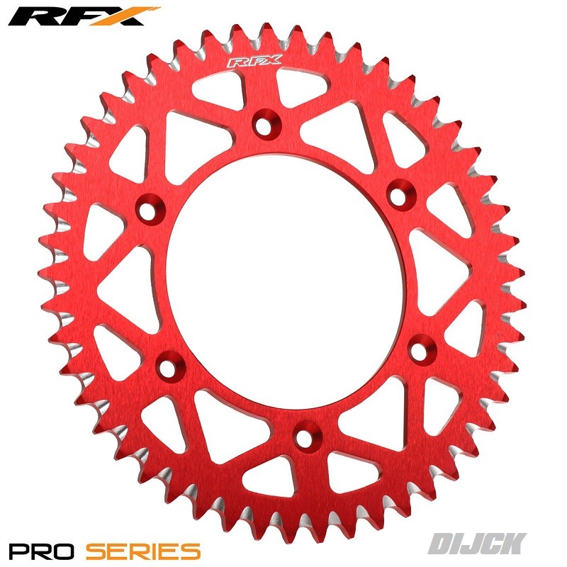 RFX Rear Sprocket REDAluminium HONDACR125 87-08CR250 87-08CRF250 04-25CRF450 02-25RFX Pro Series Rear Sprockets are CNC Machined from 7075 aerospace aluminium and feature mud clearing grooves for a longer chain and sprocket life.Features:- Laser etched RFX logo.- CNC Machined from 7075 aerospace aluminium.- Mud clearing grooves for longer lasting sprocket life.- Colour coded for each model of bike.- CAD Designed profile for Lightness- Rigid Design increase torsional- Strength Tighter Tolerances improve performance- Colour anodised for that Factory Bike look Achtertandwiel