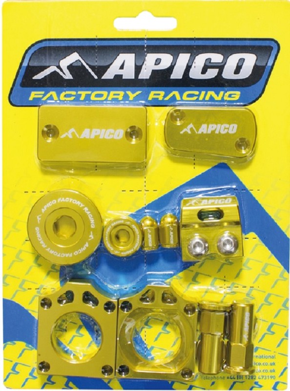 APICO Factory Bling Pack GOLDSUZUKIRMZ250 07-26 RMZ450 05-26 CONTENTS:- REAR AXLE BLOCKS - FRONT BRAKE MASTER CYLINDER COVER - REAR BRAKE MASTER CYLINDER COVER - ENGINE PLUGS - FRONT BRAKE HOSE CLAMP - VALVE CAPS - RIM LOCK NUTSBlingbling kitSKU: ABP_SUZUKI_1