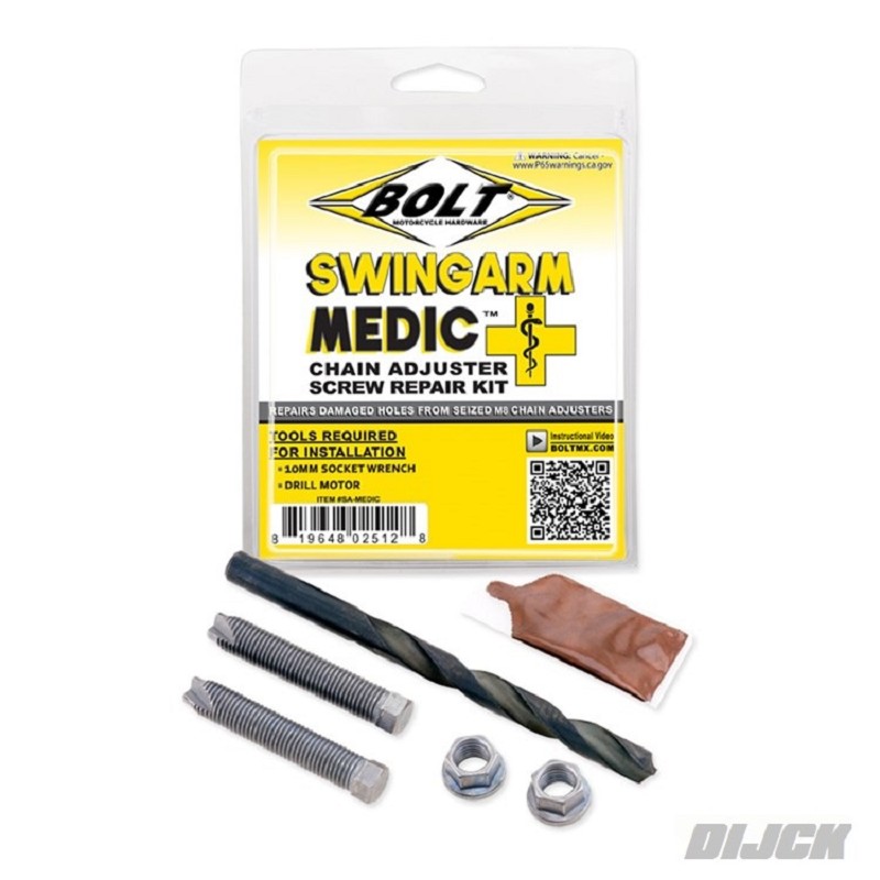 BOLT Swingarm Adjuster Repair KitIncludes Drill Bit, Thread Chasers, Nuts and Copper GreaseOmschrijving:De Swingarm Medic is de perfecte oplossing voor beschadigde of vastgelopen M8 kettingspanners.Gebruik deze set om de vorige afstelschroef uit te boren en/of de beschadigde schroefdraad schoon te maken. Onze gepatenteerde afstelschroeven kunnen ook als tap gebruikt worden. Geen rare schroefdraadinzetstukken nodig, gewoon gloednieuwe M10 kettingspanners in een nieuw geschroefde swingarm. Voor het afstellen van nieuwe kettingspanners heb je 10 mm en 13 mm sleutels nodig. Dit is de schoonste reparatieset op de markt. De set bevat:2x Tapschroeven voor de kettingspanner2x Borgmoeren1x Boortje1x Anti-seize pakket.Description:The Swingarm Medic is the perfect option for damaged or seized M8 chain adjusters. Use this kit to drill out the previous adjuster screw and/or clean out the damaged threads. Our proprietary adjuster screws also double as a tap. No silly threaded inserts needed, just brand new M10 chain adjuster screws in a newly threaded swing arm. Tools required to adjust new chain adjusters are 10mm and 13mm wrenches. This is the cleanest repair kit on the market.Included in the kit are:2x Ttapping chain adjuster screws2x Jam nuts1x Drill bit1x Anti-seize packetSKU: SA-MEDIC, SAMEDIC