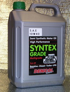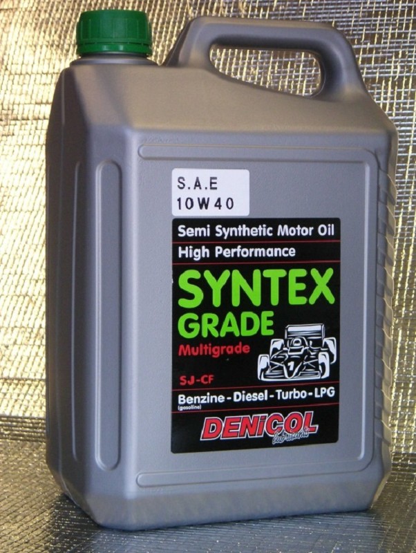 DENICOL Syntexgrade 10W40 5 literSYNTEX GRADE is een super multigrade motorolie van de laatste generatie, diespeciaal samengesteld werd voor de smering van alle viertaktbenzine- en dieselmotoren.? Grote vloeibaarheid bij lage temperatuur dankzij het gebruik van synthetische componenten? Brandstof besparend (EC = Energy Conserving)? Makkelijk starten bij koude? Stabiele viscositeit bij hoge temperaturen? Zeer hoge weerstand tegen veroudering? Laag olieverlies door verdampingPartnumber: DENSYNTEX5